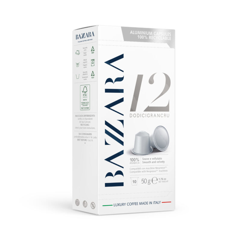 Bazzara Espresso luksuslik segu Dodicigrancru 12 pakub erakordset tasakaalu 12 parima “Gran Cru Coffea Arabica” vahel. Ühest kapslist leiad 12 preemium kvaliteediga Arabica kohvisorti eripaigust.